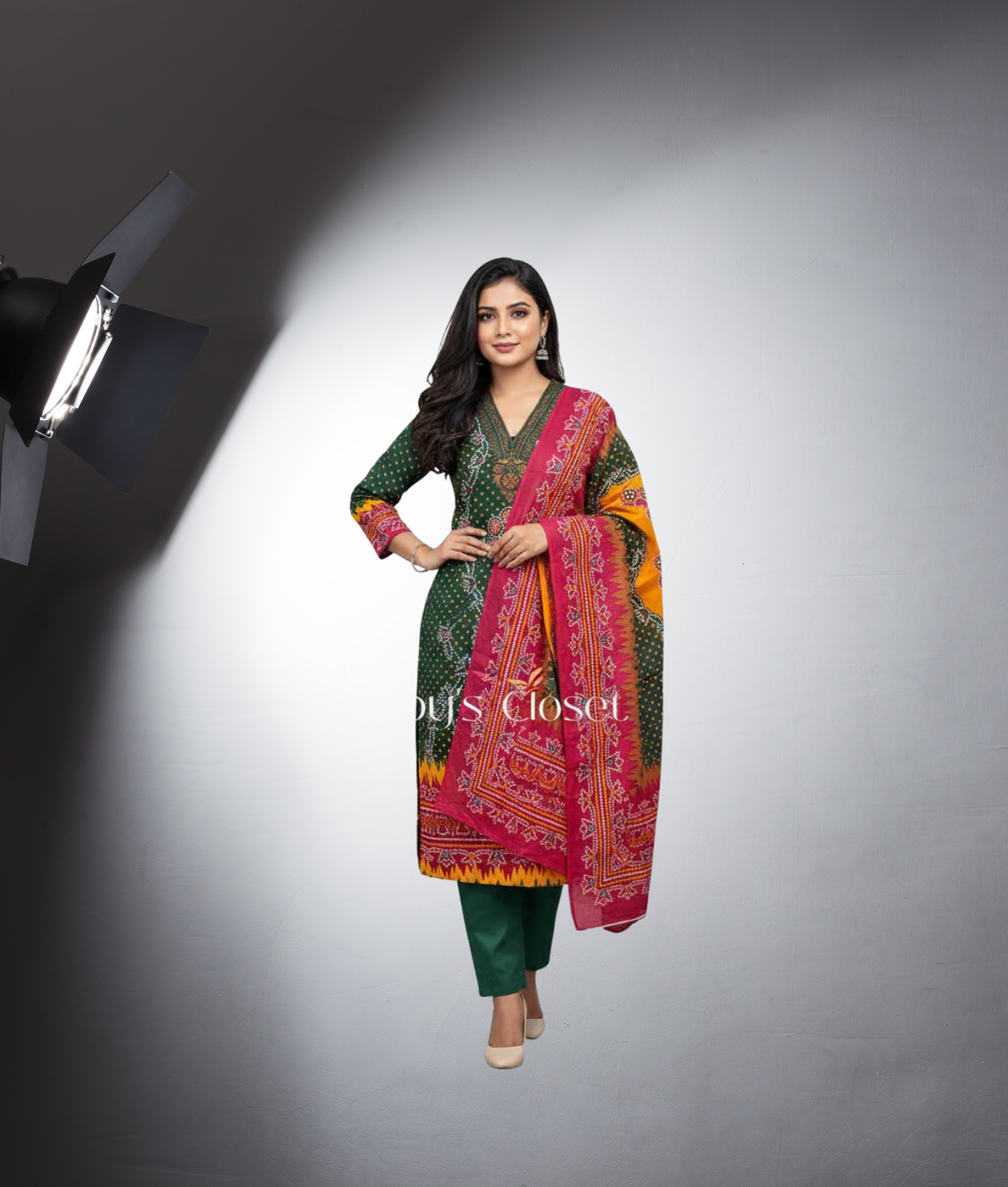 Elevate your style with our  Jom Jom Three Piece Set – Jama, Orna, and Pant crafted from 100% soft and breathable cotton fabric (Suti). Designed for both comfort and elegance, this three-piece outfit is perfect for daily wear as well as festive occasions.